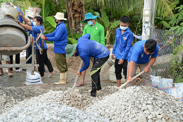 Ðoàn viên, thanh niên tham gia xây dựng cầu giao thông ở xã Thạnh Phú.
