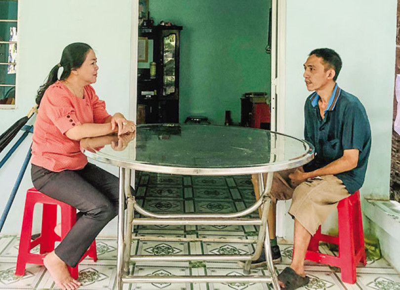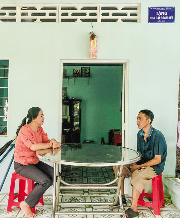 Cán bộ Mặt trận phường Long Hòa (bên trái) thăm hỏi hộ có hoàn cảnh đặc biệt khó khăn, được cất nhà Đại đoàn kết và giúp đỡ nhiều mặt ổn định cuộc sống.
