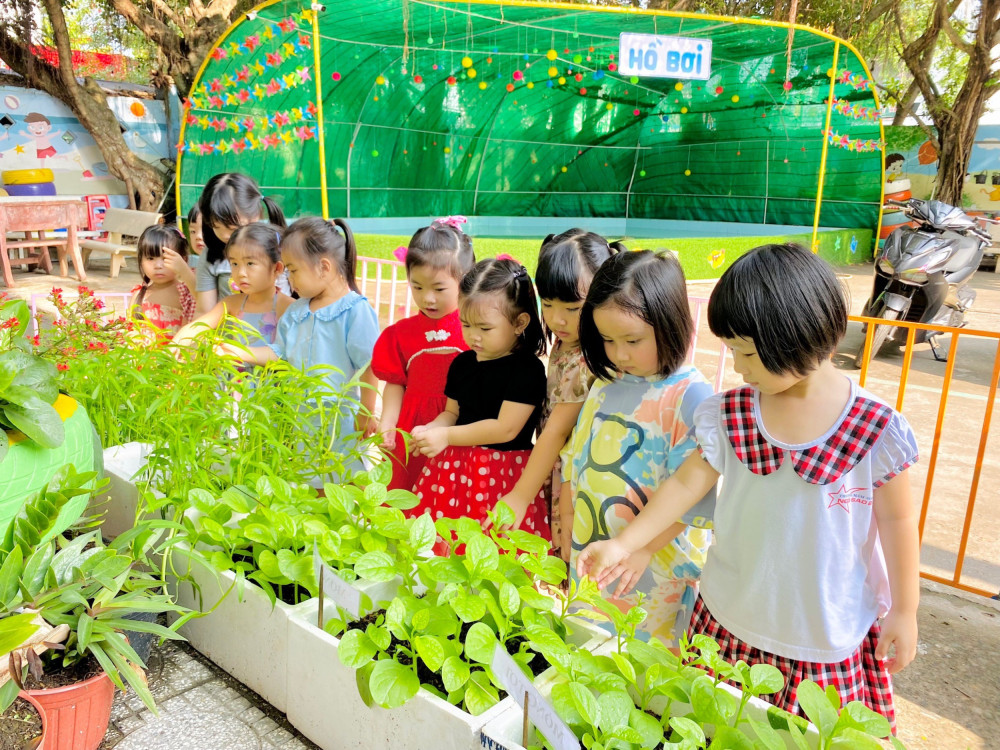 Học sinh trải nghiệm chăm sóc và tìm hiểu về các loại cây xanh.