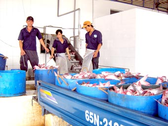 Vận chuyển cá tra nguyên liệu từ vùng nuôi về nhà máy chế biến của Công ty TNHH Thủy sản Biển Đông. |