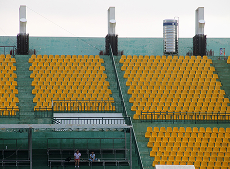 Khu vực khán đài A sân Cần Thơ đã được lắp đặt các trụ của mái che, nhưng chưa thể lắp ráp vì chờ thẩm định độ an toàn.