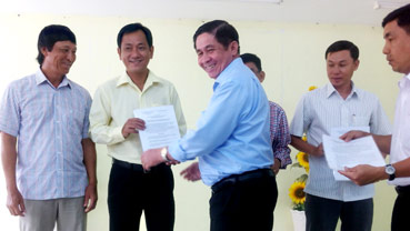 Ông Lê Việt Hùng, Chủ tịch công ty TNHH MTV XSKT Cần Thơ, trao quyết định bổ nhiệm lãnh đạo CLB XSKT Cần Thơ. |