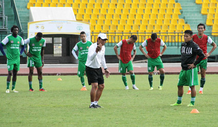 HLV Vũ Quang Bảo (giữa) chỉ đạo các học trò tập luyện trên sân Cần Thơ chiều ngày 10-12. |