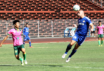 Cầu thủ XSKT Cần Thơ (phải) đá giao hữu với Đồng Tháp trên sân Cần Thơ. |