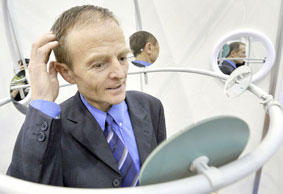 Denis Thevenin (Pháp) làm duyên với hệ thống gương cho phép chiêm ngưỡng đầu tóc ở mọi góc độ. Ảnh: Hartford Courant |