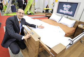 Các thiết bị tiết kiệm sức lao động tiếp tục là chủ đề trọng tâm của Hội chợ năm nay. Đáng chú ý là chiếc giường tự trải drap chỉ với một cái ấn nút của nhà phát minh Enrico Berruti đến từ Italia. Enrico tiết lộ chính căn “bệnh lười” là nguồn cảm hứng giúp anh sáng tạo ra chiếc giường gỗ độc đáo này. Tấm drap được trải ra bởi 2 chốt khóa di chuyển dọc theo 2 thanh kim loại ở hai bên giường. Một khi drap giường được trải ngay ngắn, hai thanh kim loại sẽ tự động hạ xuống sát chân giường. Giường ngủ trông rất thẳng thóm cho dù trước đó nó rất bèo nhèo. Sản phẩm này rất tiện lợi cho người bệnh không thể tự mình sắp xếp giường ngủ.