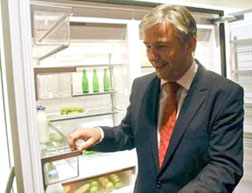 Thị trưởng Berlin, Klaus Wowereit, đang xem tủ lạnh tại quầy trưng bày của tập đoàn Miele (Đức). Ảnh: Reuters |