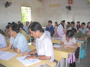 Các địa phương đang thực hiện nhiều giải pháp để nâng cao chất lượng giáo dục phổ cập. Trong ảnh: Một lớp học bổ túc văn hóa ở huyện Vĩnh Thạnh năm học 2007-2008. |