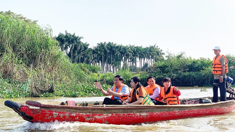 Ông Trần Văn Huyến (bên trái, hàng đầu) Phó Bí thư Thành ủy TP Cần Thơ, cùng đoàn khảo sát các điểm đến ở Cồn Sơn. Ảnh: KIỀU MAI