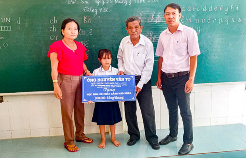 Ông Hồ Hữu Thậm (thứ 2 từ phải sang) trao tiền hỗ trợ cho học sinh. Ảnh: Nhân vật cung cấp