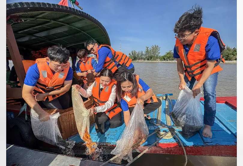 Tuổi trẻ UBND TP Cần Thơ và Đoàn phường Ninh Kiều thả cá tái tạo nguồn lợi thủy sản trên sông Hậu.