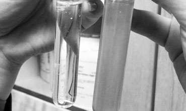 Mẫu nước bẩn (phải) sau khi được hệ thống lọc bằng sợi cellulose xử lý đã trở nên trong vắt (trái).  Ảnh: KTH
