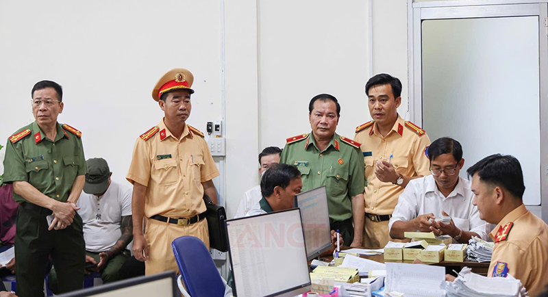 Thiếu tướng Nguyễn Văn Thuận (đứng thứ 2 bên phải), Giám đốc Công an TP Cần Thơ, kiểm tra việc tiếp nhận hồ sơ cấp giấy phép lái xe cơ giới đường bộ tại Trung tâm Phục vụ hành chính công TP Cần Thơ. Ảnh: CTV