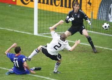 Bị dẫn trước, Đức tấn công nhanh bên cánh phải rồi tạt bóng vào vùng cấm địa cho các tiền đạo Gomez, Podolski, Klose dứt điểm. Chiến thuật này bị hàng thủ Croatia dễ dàng hóa giải, “Cỗ xe tăng” chuyển sang tấn công biên trái, chuyền bóng bổng cho tiền đạo Gomez “không chiến”. Gomez và hậu vệ Metzelder đã có hai pha đánh đầu vọt xà ngang khung thành Croatia trong gang tấc. Tuy nhiên, thủ thành Pletikosa thi đấu tập trung, góp phần không nhỏ giúp Croatia giữ sạch lưới trong hiệp một.