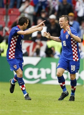 Hai “sát thủ” Darijo Srna (trái) và Ivica Olic góp 2 bàn thắng hạ gục đội tuyển Đức. Anh: AP. |