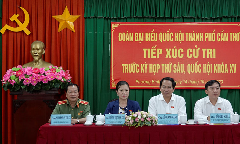 (CT) - Ngày 14-10, các đại biểu Quốc hội (ÐBQH) thuộc Ðoàn ÐBQH TP Cần Thơ, gồm: ông Lê Quang Mạnh, Ủy viên Trung ương Đảng, Chủ nhiệm Ủy ban Tài chính - Ngân sách của Quốc hội, Trưởng Đoàn ĐBQH TP Cần Thơ; bà Trương Thị Ngọc Ánh, Phó Chủ tịch Ủy ban Trung ương MTTQVN; ông Ðào Chí Nghĩa, Phó trưởng đoàn chuyên trách Ðoàn ÐBQH thành phố; ông Nguyễn Văn Thuận, Giám đốc Công an TP Cần Thơ, tiếp xúc cử tri (TXCT) tại phường An Hòa (quận Ninh Kiều) và phường Bình Thủy (quận Bình Thủy).