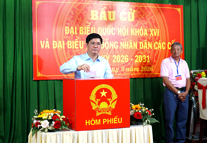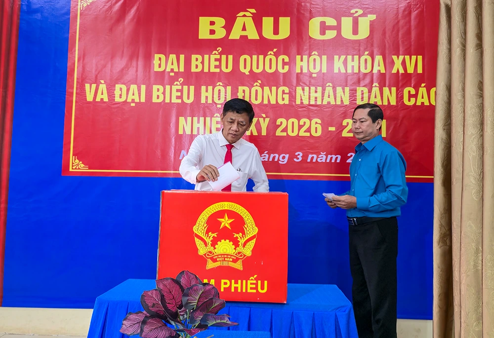 Đúng 8 giờ 30 phút, ông Lê Quang Tùng, Ủy viên Ban Chấp hành Trung ương Đảng, Bí thư Thành ủy và ông Nguyễn Tuấn Anh, Phó Bí thư Thành ủy, Trưởng Đoàn đại biểu Quốc hội TP Cần Thơ đã đến bỏ phiếu bầu cử đại biểu Quốc hội khóa XVI và đại biểu HĐND các cấp nhiệm kỳ 2026-2031 tại Khu vực bỏ phiếu số 22, phường Ninh Kiều, tại Nhà Văn hóa khu vực 6, phường Ninh Kiều.