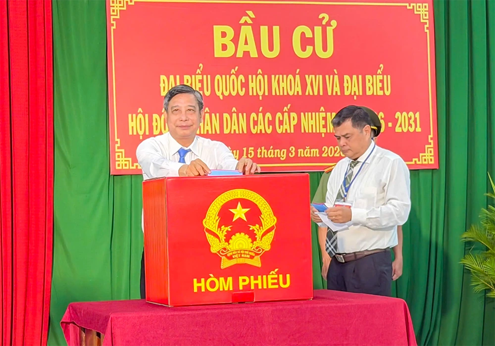 Ông Trương Cảnh Tuyên, Phó Bí thư Thành ủy, Chủ tịch UBND thành phố, bỏ lá phiếu đầu tiên tại Khu vực bỏ phiếu số 3, phường Tân An. Ảnh: NGỌC QUYÊN