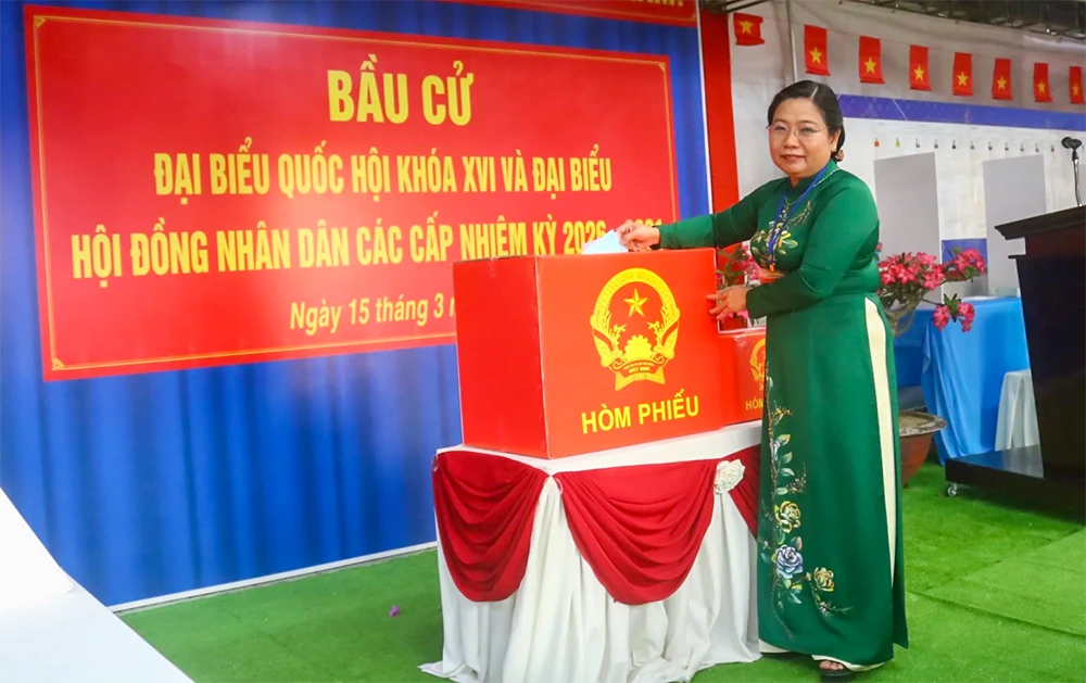 Bà Hồ Thị Cẩm Đào, Phó Bí thư Thành ủy, Chủ tịch Ủy ban MTTQVN TP Cần Thơ, thực hiện quyền công dân của mình tại Khu vực bỏ phiếu số 14, Đơn vị bầu cử số 2, phường Mỹ Xuyên. Ảnh: XUÂN NGUYÊN