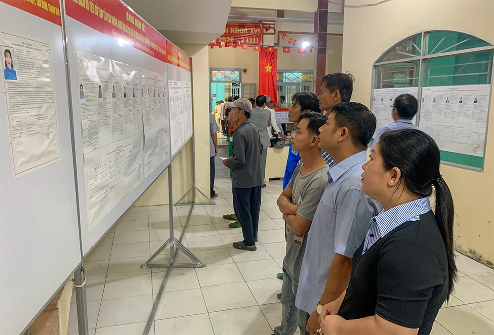 Cử tri Khu vực bầu cử số 14, xã Tân Hòa, có mặt từ rất sớm để tìm hiểu tiểu sử những người ứng cử đại biểu Quốc hội và HĐND trên địa bàn xã. Ảnh: ĐÌNH BẢO