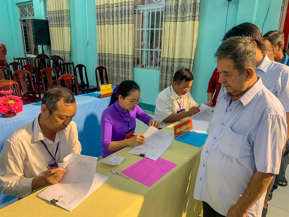 Thành viên Khu vực bỏ phiếu số 14, xã Tân Hòa, kiểm tra thông tin cử tri. Ảnh: ĐÌNH BẢO