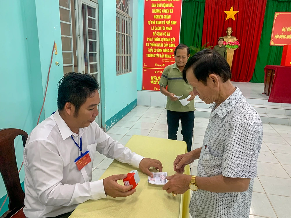 Đóng dấu xác nhận cử tri đã hoàn thành việc bỏ phiếu. Ảnh: ĐÌNH BẢO