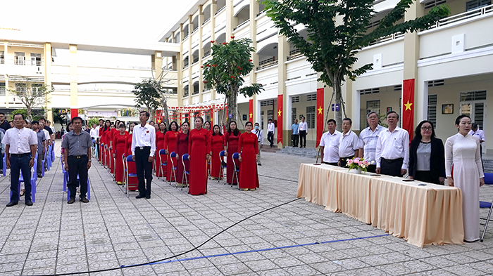 Đại biểu thực hiện nghi thức chào cờ tại Lễ khai mạc ở Khu vực bỏ phiếu số 7, phường Phú Lợi. Ảnh: THANH TÂM