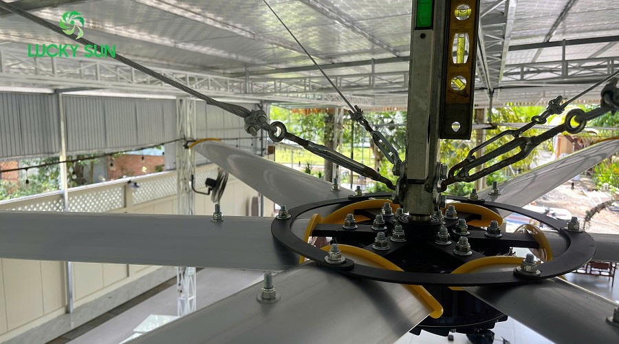 - Hệ thống thanh căng - dây cáp an toàn: Các thanh căng và cáp thép được cố định chắc chắn giữa trục quạt, cánh quạt và kết cấu trần.