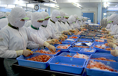 Với FTA Việt Nam - Hàn Quốc ký kết tháng 5-2015, ở mặt hàng tôm, Hàn Quốc cấp hạn ngạch cho Việt Nam 10.000 tấn/năm và tăng dần sau 5 năm đến mức 15.000 tấn/năm với thuế suất 0%. Trong ảnh: Chế biến tôm xuất khẩu tại Công ty TNHH Thực phẩm Thủy sản Nam Hải, TP Cần Thơ. Ảnh: M. HUYỀN
