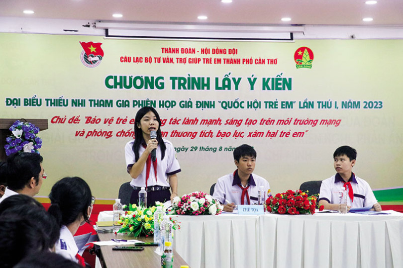 Phiên họp giả định “Quốc hội trẻ em” lần thứ nhất, do Trung ương Ðoàn - HÐÐ Trung ương phối hợp Ủy ban Văn hóa, Giáo dục của Quốc hội, Văn phòng Quốc hội tổ chức vào cuối tuần qua, thu hút 263 đại biểu thiếu nhi đến từ 63 tỉnh, thành. TP Cần Thơ có 3 thiếu nhi tham gia phiên họp này. Trước đó, HÐÐ TP Cần Thơ đã tổ chức chương trình lấy ý kiến đại biểu thiếu nhi tham gia phiên họp giả định “Quốc hội trẻ em” vào cuối tháng 8-2023. Theo đó, 3 thiếu nhi được chọn tham gia Phiên họp giả định “Quốc hội trẻ em” đóng vai đại biểu Quốc hội (ÐBQH) tiếp xúc cử tri trước kỳ họp, đã ghi nhận 14 ý kiến của các “cử tri nhí” xoay quanh 2 chủ đề: Bảo vệ trẻ em tương tác lành mạnh, sáng tạo trên môi trường mạng và phòng, chống tai nạn thương tích, bạo lực, xâm hại trẻ em.