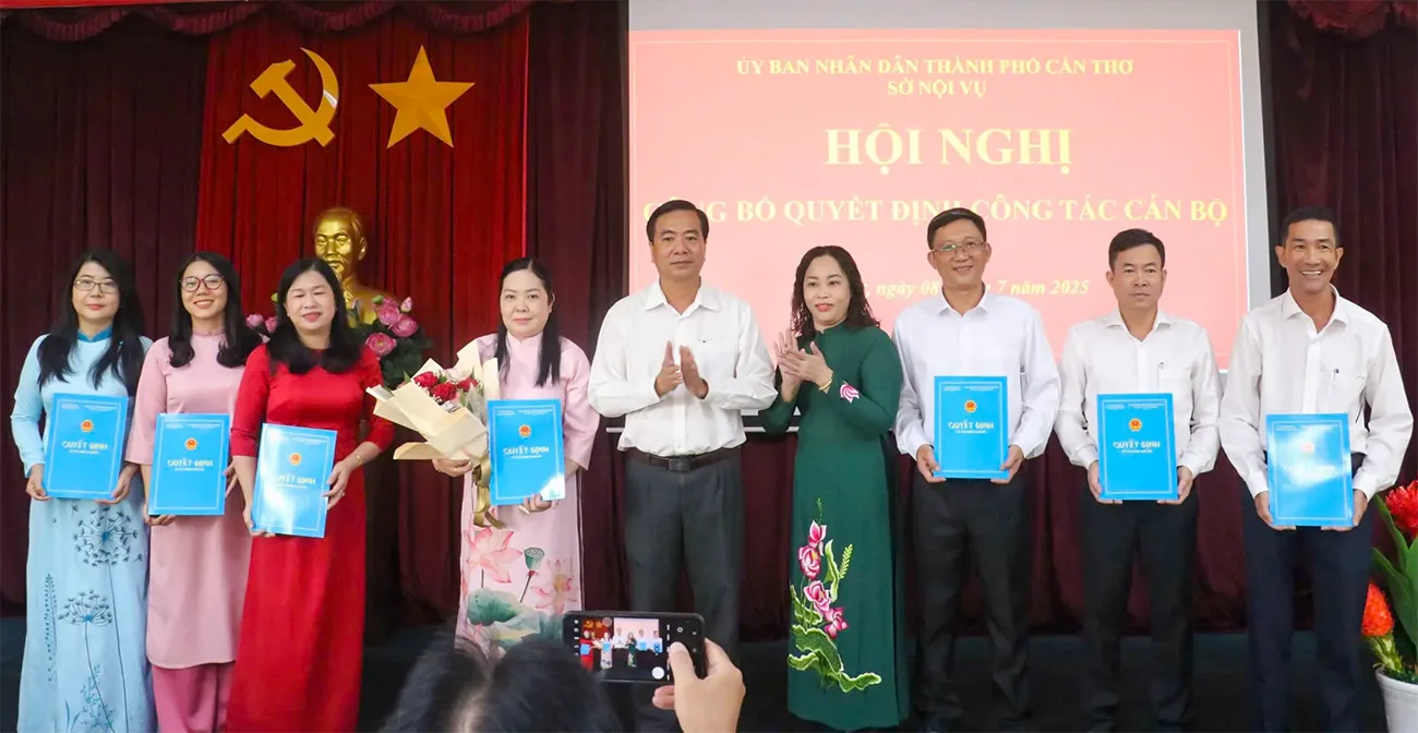 Lãnh đạo Sở Nội vụ TP Cần Thơ trao quyết định về công tác cán bộ sau khi hợp nhất 3 tỉnh, thành: Cần Thơ, Sóc Trăng và Hậu Giang. Ảnh: Q. THÁI