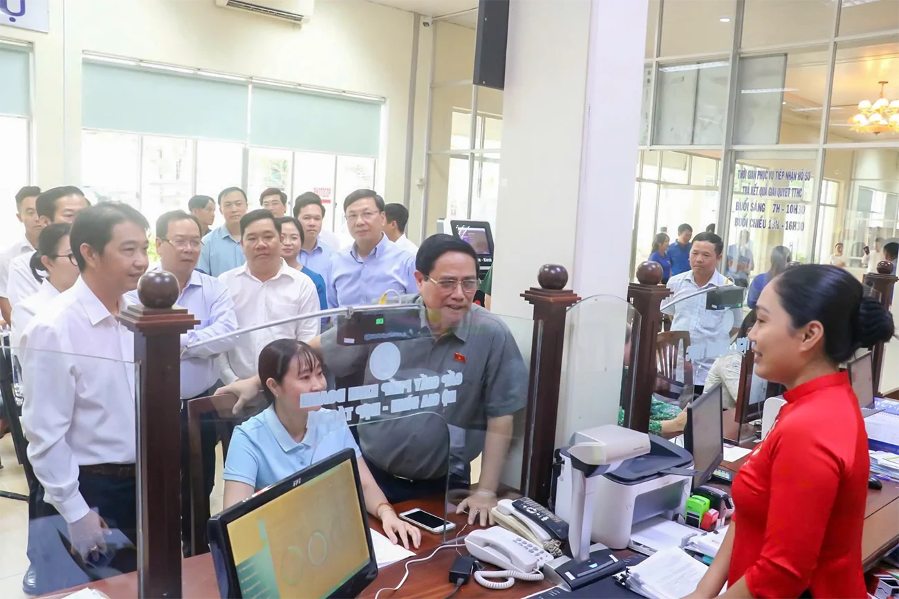Thủ tướng Chính phủ Phạm Minh Chính kiểm tra tình hình hoạt động của Trung tâm Phục vụ hành chính công phường Ninh Kiều. Ảnh: Q. THÁI