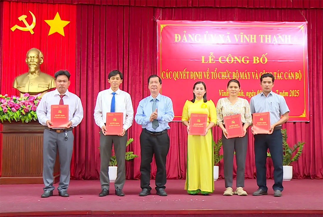 Lãnh đạo Đảng ủy xã Vĩnh Thạnh trao quyết định về tổ chức bộ máy và công tác cán bộ, đáp ứng yêu cầu vận hành bộ máy của xã Vĩnh Thạnh (mới). Ảnh: CTV