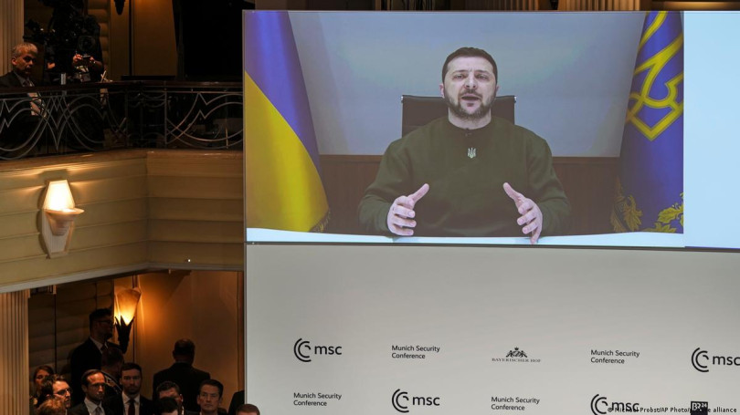 Tổng thống Ukraine Volodymyr Zelensky trong bài phát biểu qua video thu sẵn gửi tới MSC. Ảnh: DW