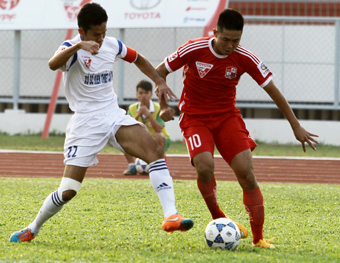 XSKT Cần Thơ (trái) đang nỗ lực tìm chiến thắng. Trong ảnh: trung vệ đội trưởng Văn Quân cản đường lên bóng của tiền đạo Đồng Nai. |