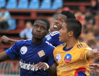 Mustapha (giữa) và đồng đội Souleymane tranh bóng với hậu vệ Đồng Tháp. |