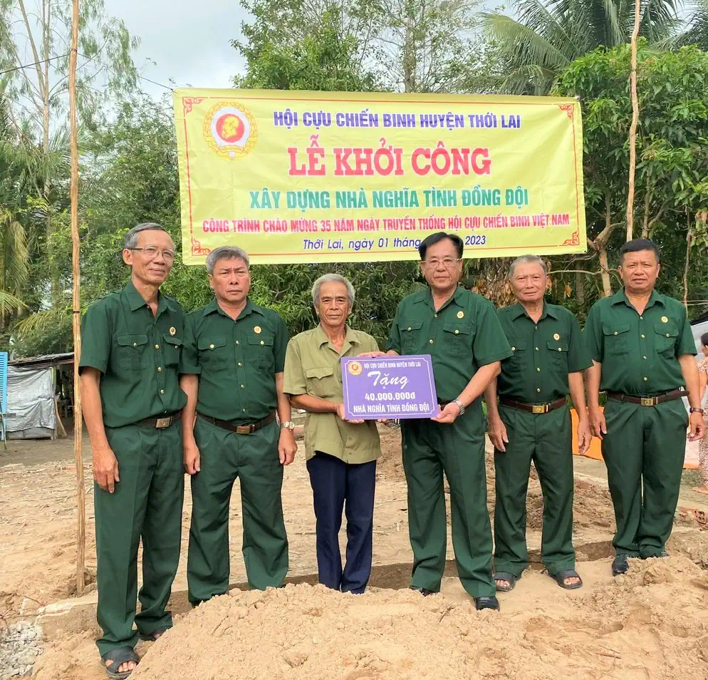 Ðầu tháng 12-2023, Hội CCB huyện Thới Lai khởi công xây dựng nhà Nghĩa tình đồng đội cho CCB Lê Văn Hùng, ở ấp Thới Phước 1, xã Tân Thạnh. Căn nhà trị giá 50 triệu đồng, do cán bộ, hội viên CCB huyện đóng góp. CCB Lê Văn Hùng thuộc diện hộ có hoàn khó khăn, không có ruộng đất, làm thuê để sinh sống… Dự kiến căn nhà của CCB Lê Văn Hùng sẽ hoàn thành trước Tết Nguyên đán 2024. “Mỗi năm, chúng tôi vận động hội viên đóng góp xây dựng 1-2 căn nhà Nghĩa tình đồng đội. Riêng trong năm 2023, các cấp Hội CCB huyện Thới Lai đã vận động hỗ trợ xây dựng 7 căn nhà, sửa chữa 2 căn nhà cho các hội viên gặp khó khăn về nhà ở với tổng số tiền trên 480 triệu đồng” - ông Nguyễn Văn Nghĩa, Chủ tịch Hội CCB huyện Thới Lai cho biết.