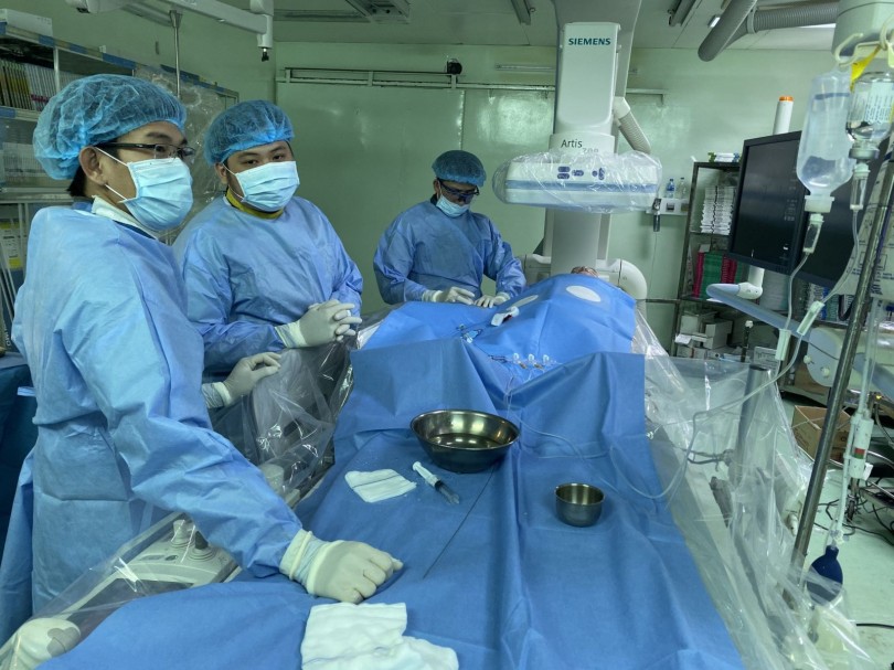 Êkip can thiệp do Ths. Bs Trần Văn Triệu (thủ thuật viên chính), bác sĩ Nguyễn Huỳnh Minh Thông đã tiến hành can thiệp mạch vành bằng cách nong bóng và đặt stent phủ thuốc vào đoạn III động mạch vành phải và nhánh liên thất sau đường kính (3.5 x 24mm). Quá trình can thiệp gặp nhiều khó khăn do: bệnh nhân lớn tuổi nên động mạch vành bị vôi hóa nặng, bệnh nhân đã được đặt 2 stent động mạch vành trước đó. Qua 90 phút tiến hành thủ thuật, động mạch vành của bệnh nhân đã được tái thông trở lại. Sau can thiệp: mạch, huyết áp ổn định, giảm đau ngực nhiều, tiếp tục được theo dõi và điều trị tại Khoa Tim mạch can thiệp.