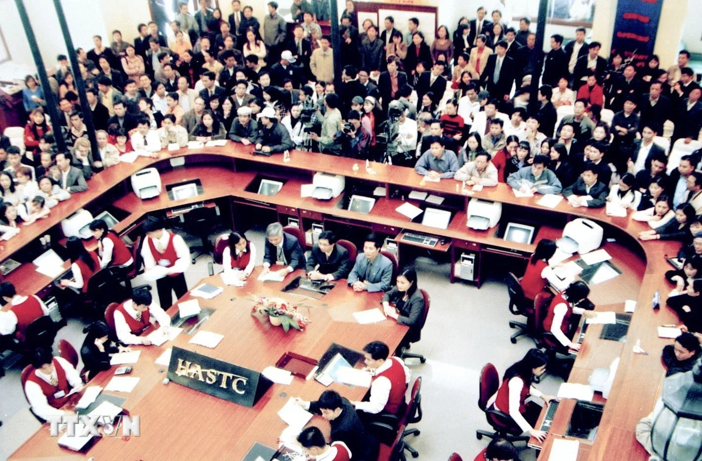 Phiên đấu giá cổ phần Nhà máy thủy điện Vĩnh Sơn Sông Hinh (Tổng Công ty điện lực Việt Nam), tại Trung tâm Giao dịch chứng khoán Hà Nội, ngày 10/3/2005. (Ảnh: Quang Hải/TTXVN)