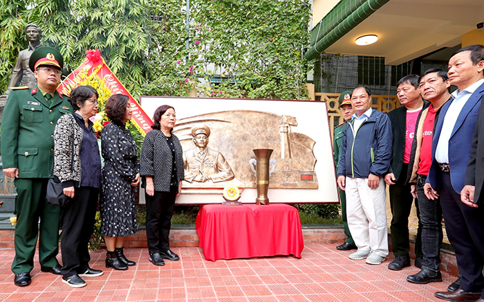 Đội bóng đá Thể Công - Viettel trao tặng bức phù điêu chân dung Đại tướng Võ Chí Thanh và chiếc cúp vô địch 1974 đến Bảo tàng Đại tướng Nguyễn Chí Thanh. Ảnh: Hoàng Hiếu (TTXVN)