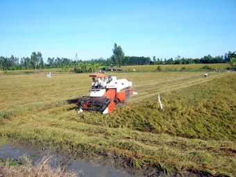 Thu hoạch lúa hè thu tại huyện Vị Thủy, tỉnh Hậu Giang. |