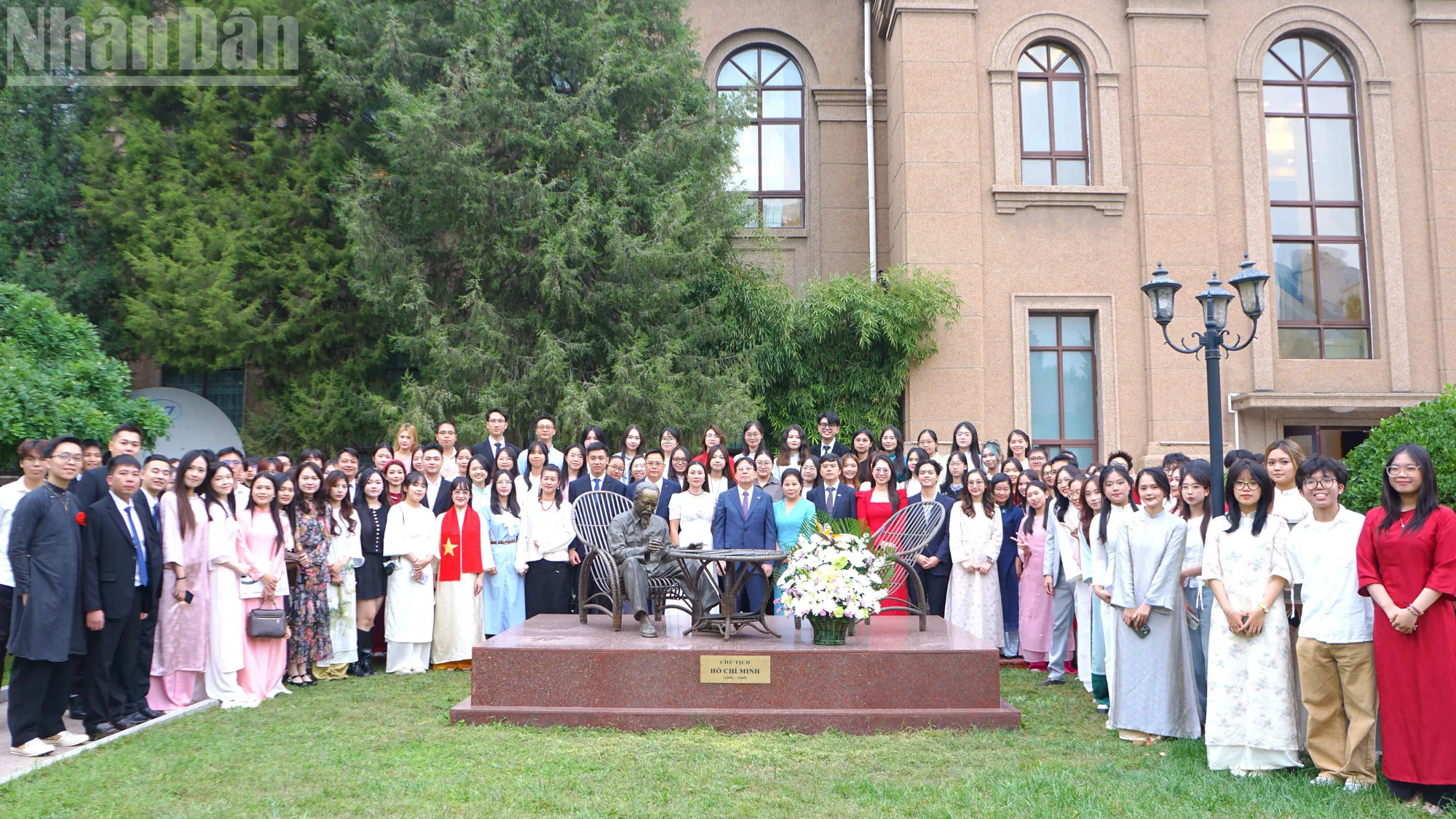 Đồng chí Nguyễn Duy Phóng cùng các cán bộ, đảng viên, đại diện cộng đồng và lưu học sinh chụp ảnh lưu niệm bên tượng Bác Hồ trong khuôn viên Đại sứ quán.