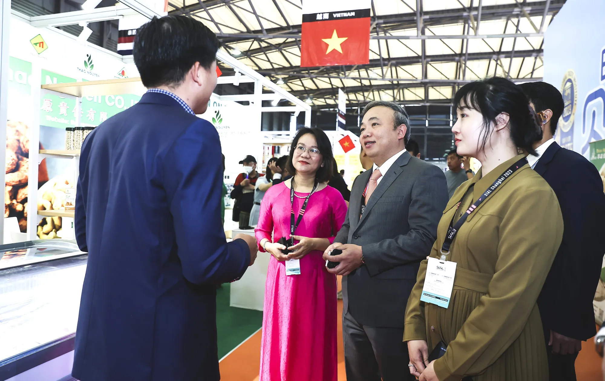 Tổng Lãnh sự Việt Nam tại Thượng Hải Nguyễn Thế Tùng (người đứng giữa) thăm Khu gian hàng Việt Nam tại Hội chợ thực phẩm quốc tế Sial Thượng Hải 2023.
