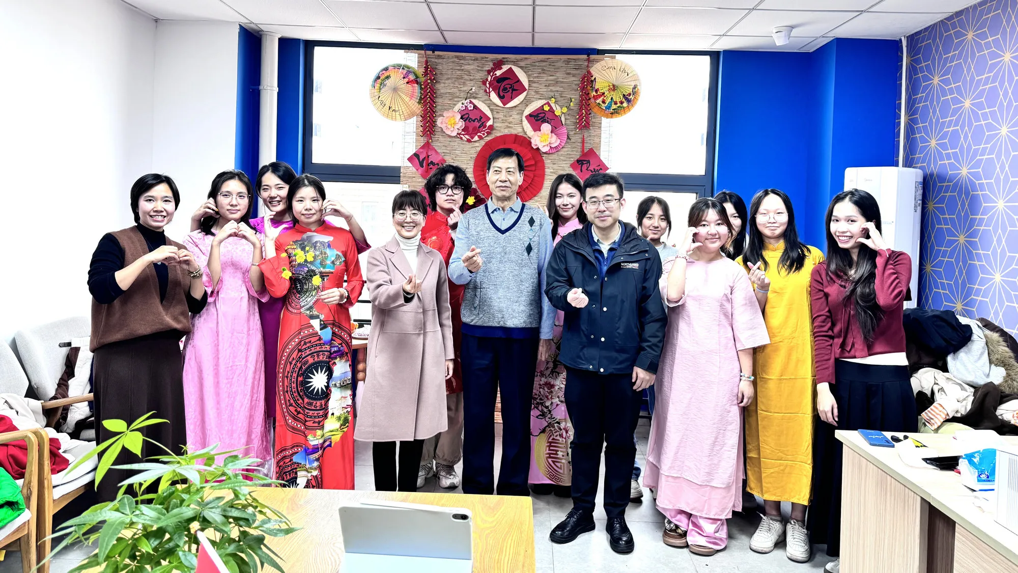 Tiến sĩ Nguyễn Thị Vân Quỳnh (ngoài cùng bên trái) tổ chức Trải nghiệm văn hóa Việt Nam - Chủ đề Tết Việt cho sinh viên chuyên ngành tiếng Việt của Trường đại học Ngoại ngữ Chiết Giang (tháng 12/2025).