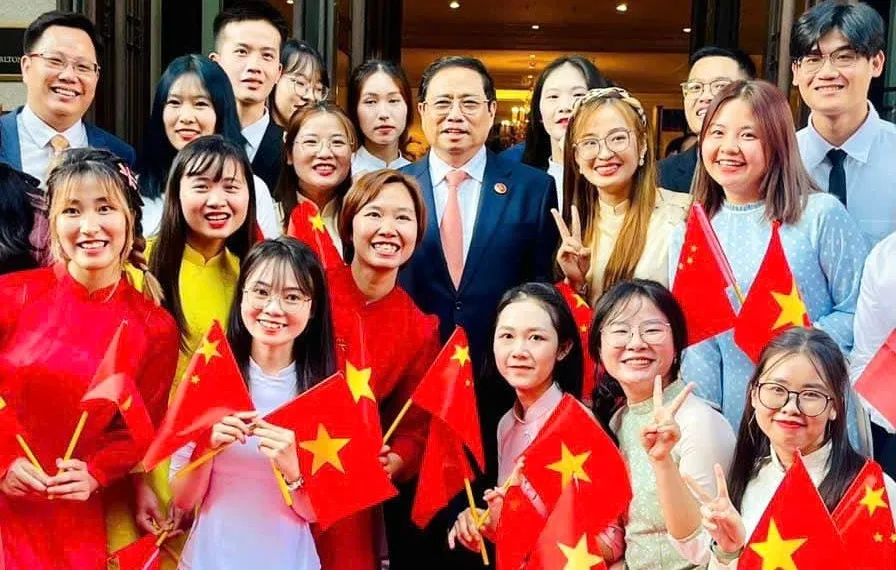 Đồng chí Nguyễn Thị Vân Quỳnh (người mặc áo dài đỏ ở giữa) cùng các bạn lưu học sinh tham gia đón Thủ tướng Phạm Minh Chính đến thăm và làm việc tại thành phố Thiên Tân, Trung Quốc năm 2023.