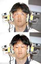 Tập đoàn di động NTT DoCoMo (Nhật) vừa trình làng cặp tai nghe có gắn hệ thống cảm biến và chip điện tử, cho phép người dùng điều khiển máy nghe nhạc MP3 chỉ bằng động tác đảo mắt lên xuống hoặc qua lại. Khi đeo tai nghe này, chuyên gia Hiroyuki Manabe (trong ảnh) có thể tăng âm lượng máy MP3 chỉ bằng cái liếc mắt hoặc chuyển sang bài hát tiếp theo bằng cách đảo mắt 2 lần về bên phải.