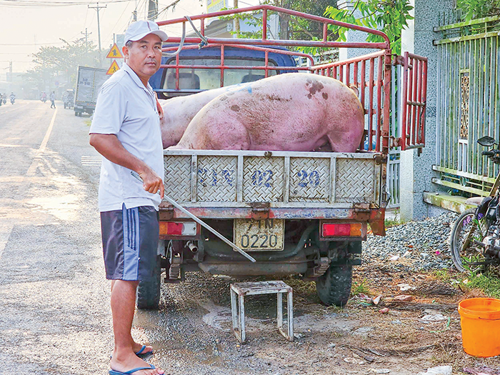 Thương lái thu mua heo hơi của người dân tại huyện Chợ Lách, tỉnh Bến Tre.