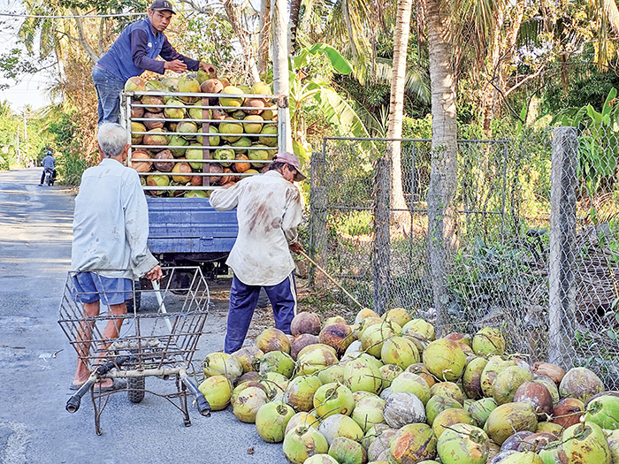 Thương lái thu mua dừa khô của nông dân tại huyện Mỏ Cày Bắc, tỉnh Bến Tre.