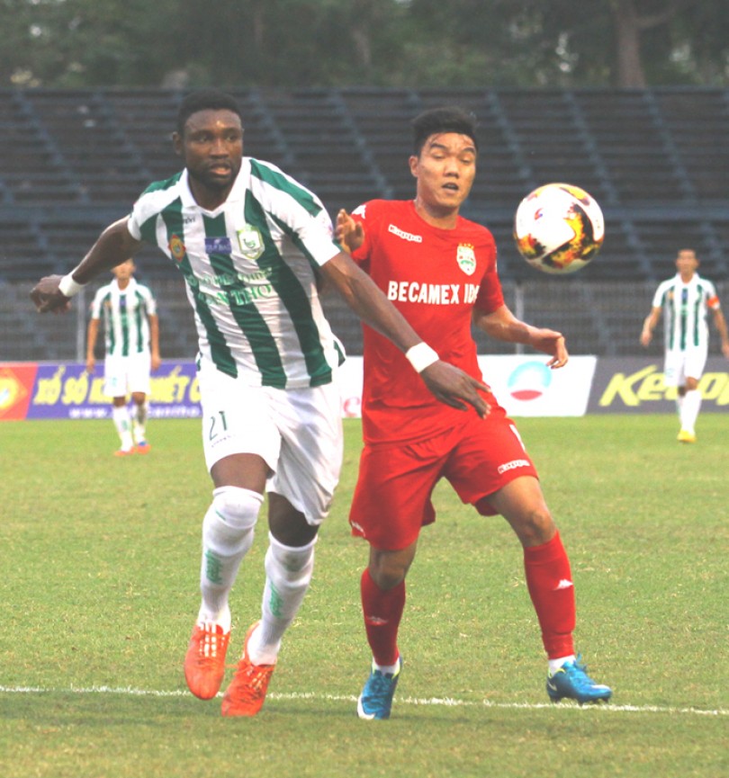 Nsi (trái) là chân sút số 1 của XSKT Cần Thơ, nhưng không thể giúp nhiều cho đội nhà trong trận lượt đi thua Bình Dương 1-5.