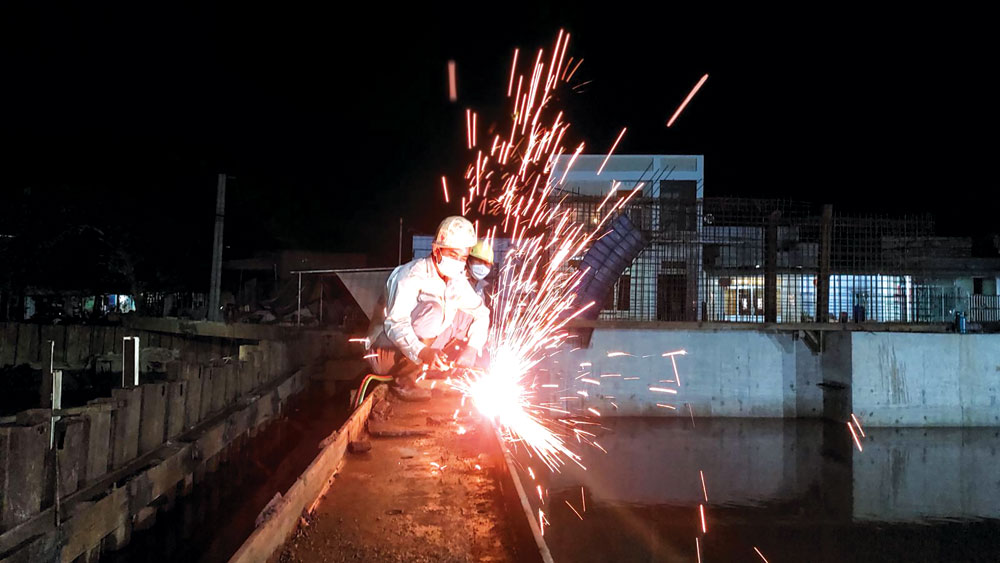 làm việc ca đêm trên công trường của gói thầu CT3-PW-1.5 xây dựng cống ngăn triều rạch Đầu Sấu.